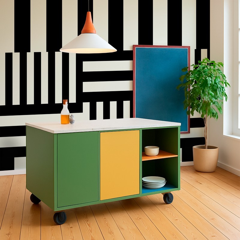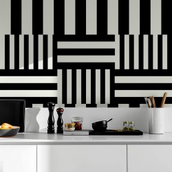 Ses bandes géométriques créent un rythme visuel contemporain qui transforme instantanément vos murs.
